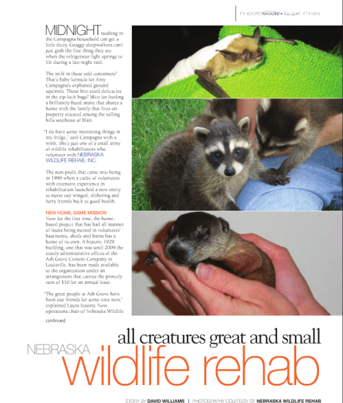 Through the generous support of Ash Grove in Louisville, Nebraska, NWRI has a new home in a 4,500 square foot building just off Highway 50 and just 10 minutes south of the I-80 Sapp Brothers exit. NWRI accomplishes its mission through the efforts of unpaid volunteers. This new home allows NWRI to give better support to its volunteers and provides a great location for the wildlife rehabilitation training that each volunteer must take.
